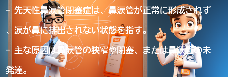 先天性鼻涙管閉塞症は、生まれつき鼻涙管が閉塞している状態を指します。鼻涙管は、目から鼻へ涙を排出するための管であり、閉塞することで涙が鼻から流れずに目にたまる症状が現れます。