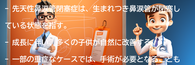 先天性鼻涙管閉塞症は、一般的には自然に改善する傾向がありますが、症状が長期間続く場合や重篤な場合には医師の診断と治療が必要です。早期の治療は合併症のリスクを減らし、患者の生活の質を向上させることができます。